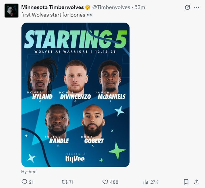 森林狼:海兰德、迪温琴佐、懒得耳朵、麦克丹尼尔斯、戈贝尔;