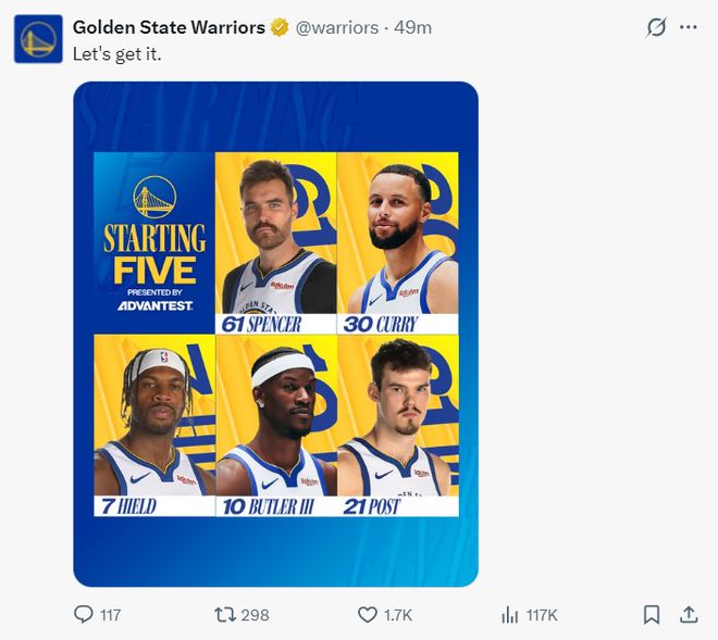 勇士:库里、希尔德、斯潘塞、巴特勒、波斯特;