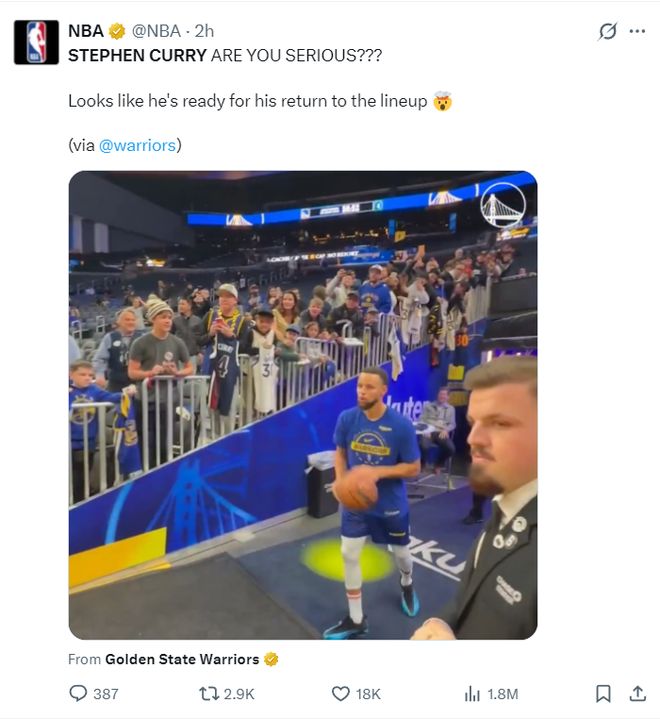 斯蒂芬-库里因伤缺席五场比赛后复出,而且没有登场时间限制。但德雷蒙德-格林轮休。