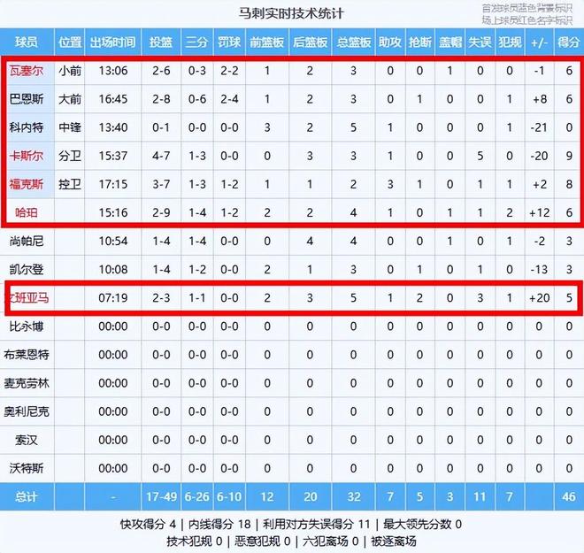 卡斯尔9分3板1助、福克斯8分2板3助、哈珀6分4板1助、巴恩斯6分3板、瓦塞尔6分3板、文班亚马5分5板1助2断、尚帕尼3分4板、凯尔登3分3板、科内特5板1助